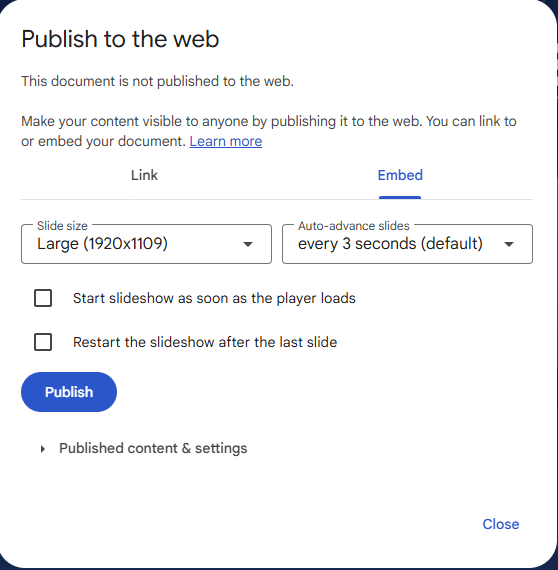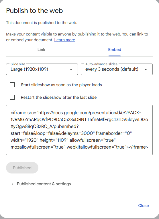 From your Google Slides presentation, use File / Share / Publish to web / Embed