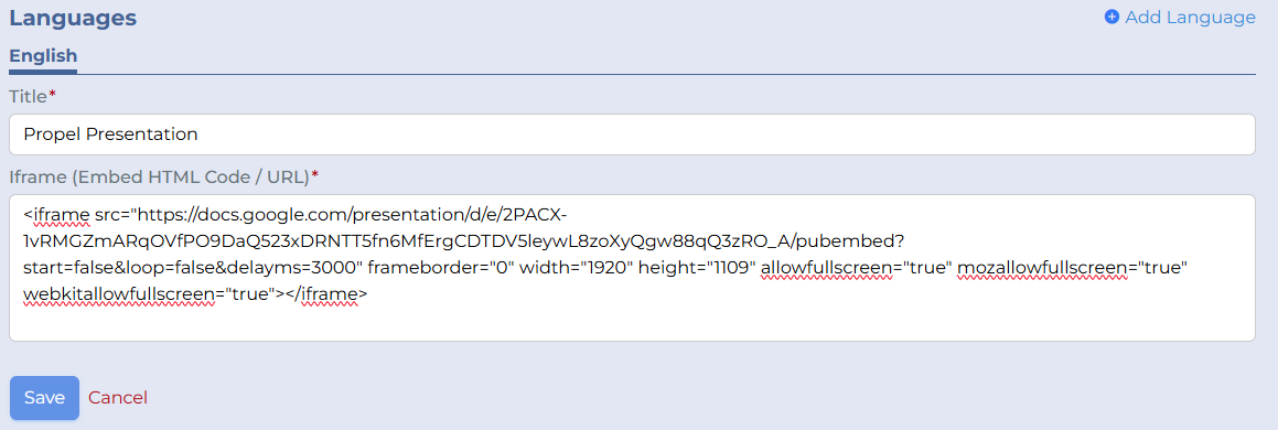 Paste the URL in a new Propel Your MSP IFrame / Google Slide Custom Content:Note: During the initial save, Propel will extract the necessary URL from the HTML code and only keep that information as that this all we need.