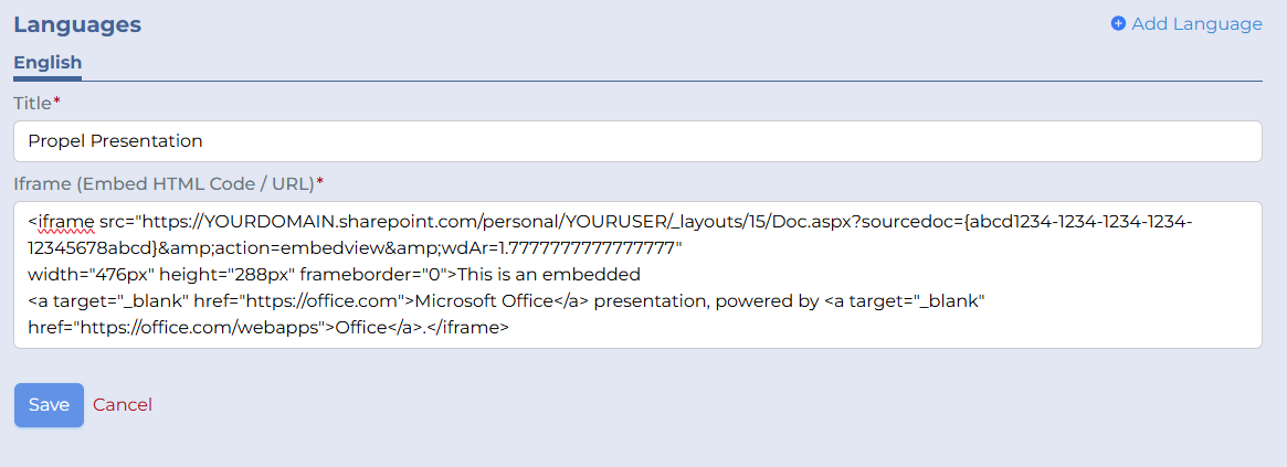 Note: During the initial save, Propel will extract the necessary URL from the HTML code and only keep that information as that this all we need.