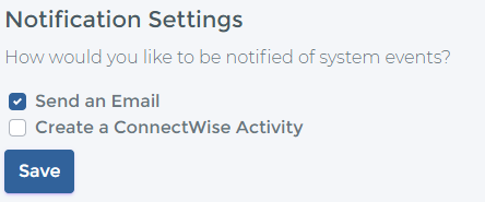 The notifications to vCIOs can be sent either by email or by creating a ConnectWise Activity, or both. This is configured per user and is accessible from the "My Profile" (top right corner)